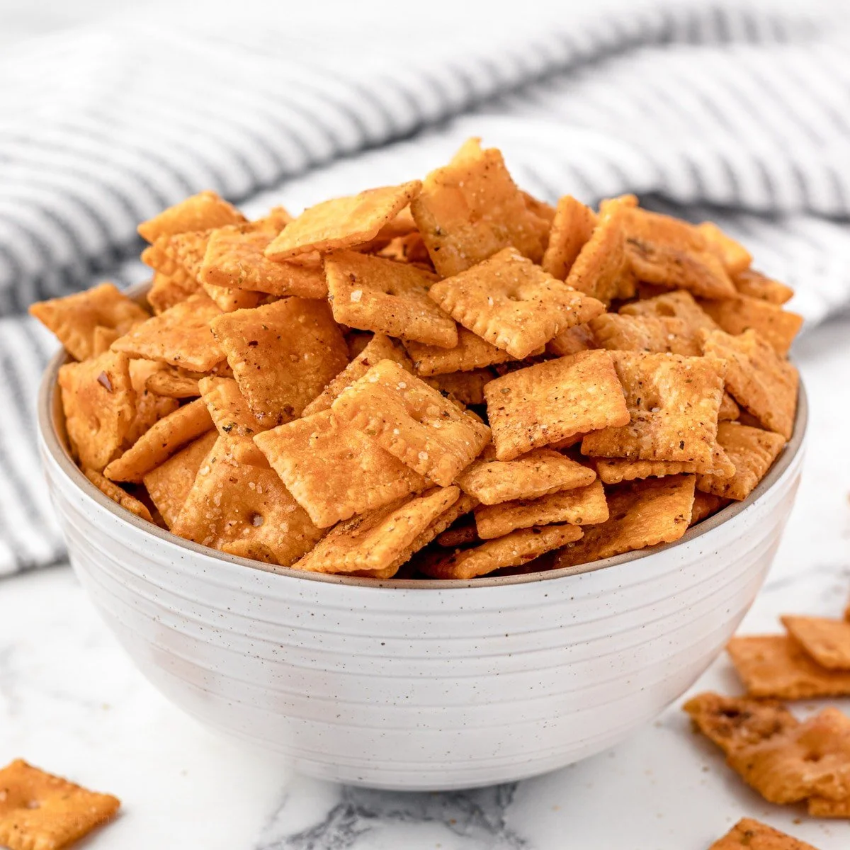 Pour the Cheeze-its into a large mixing bowl and add butter slowly while mixing